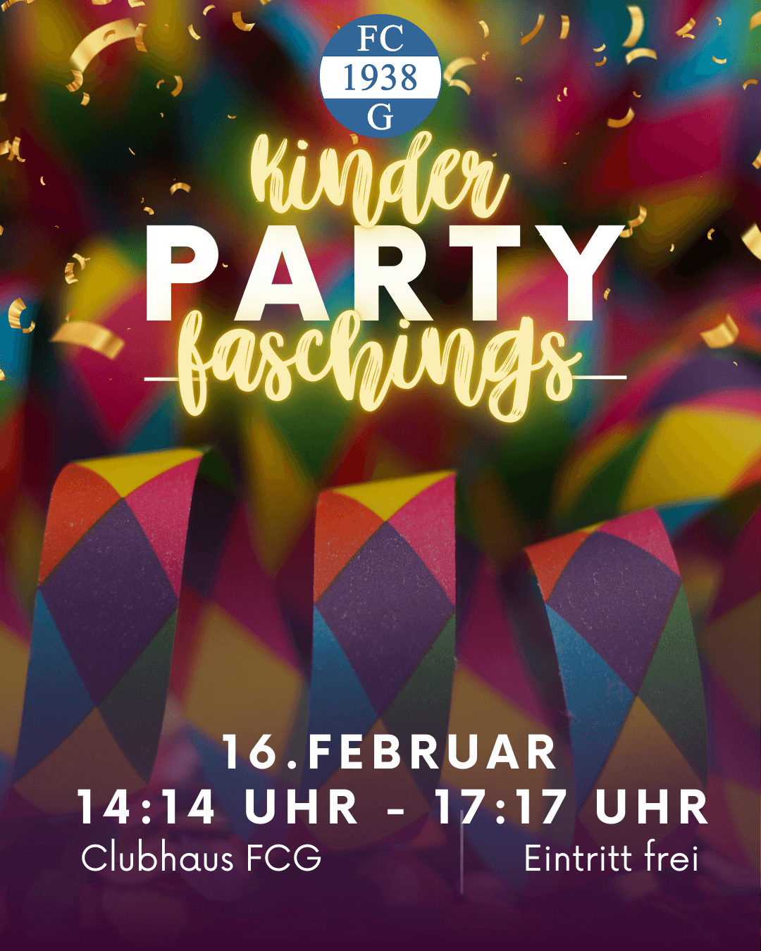 Am 16. Februar ist wieder Kinderfasching Clubhaus! Ab 14:14 Uhr dürfen Kinder und Eltern Fasching mit uns feiern! Eintriit Frei!